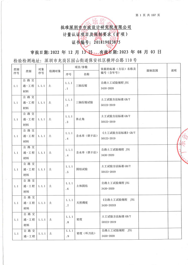 2022年11月,廣東省質(zhì)量監(jiān)督局委派6名專家來公司檢測試驗(yàn)中心開展為期2天的現(xiàn)場評(píng)審。在資料審核和現(xiàn)場實(shí)操考核結(jié)束后,評(píng)審專家一致認(rèn)為場地、設(shè)備設(shè)施、人員及管理體系等符合評(píng)審要求,準(zhǔn)予通過現(xiàn)場評(píng)審。經(jīng)過為期30多天的審批,廣東省質(zhì)量監(jiān)督局于12月19日向公司發(fā)放擴(kuò)項(xiàng)證書。至此,公司檢測能力由原來的594項(xiàng)達(dá)到了44個(gè)專業(yè)1451項(xiàng),參數(shù)覆蓋了目前鐵投城際鐵路項(xiàng)目所需參數(shù)的90%。