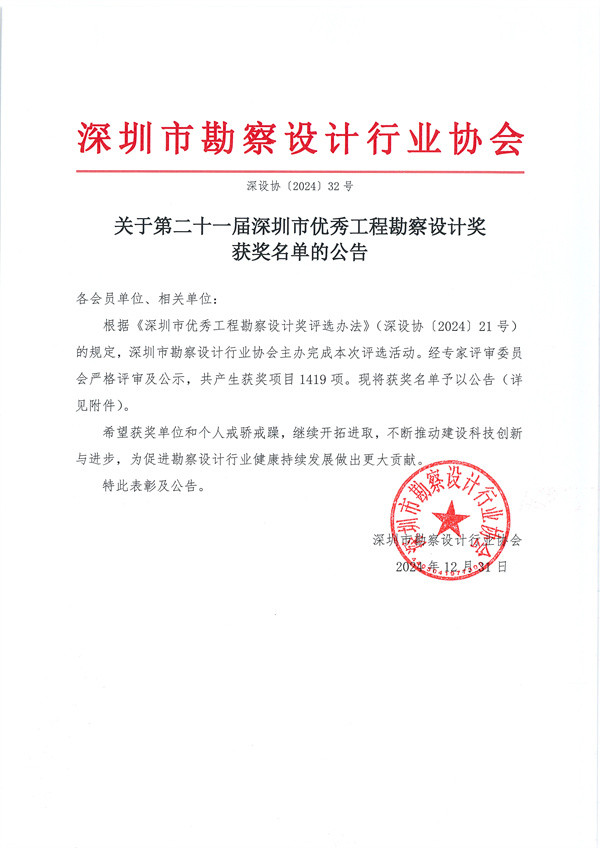 2024年深圳市第二十一屆優(yōu)秀工程勘察設計獎評選結果正式揭曉。經過三輪嚴格的評審流程,公司共82個項目獲獎,包括一等獎25項、二等獎32項、三等獎25項。獎項覆蓋了工程勘察與巖土工程、住宅及住宅小區(qū)設計、市政公用工程設計等13個主要關鍵領域。