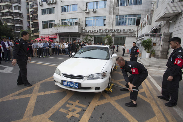 在緊張的滅火救援過程中,一名“恐怖分子”趁亂混進(jìn)停車場(chǎng),抽出長刀對(duì)車輛亂砸亂砍,引起了現(xiàn)場(chǎng)的騷亂。保安員立刻抽調(diào)人手?jǐn)y帶防暴器械進(jìn)行阻止。面對(duì)窮兇極惡的“恐怖分子”,平時(shí)訓(xùn)練有素的保安員毫不畏懼,利用防暴盾、防暴鋼叉等器械對(duì)其進(jìn)行壓制,經(jīng)過一番周旋和搏斗后成功將其制服。