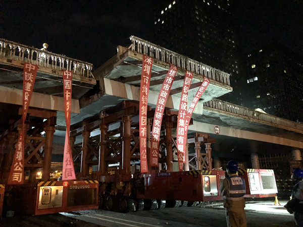 施工單位提前完成橋面設(shè)施拆除、鉆孔、設(shè)備安裝等準(zhǔn)備工作后,2017年12月29日晚11點開始拆橋工作,至2018年1月2日凌晨4點深南大道南北兩側(cè)交替封道4晚,彩田橋中間4跨連續(xù)梁采用SPMT模塊車順利拆除。拆除橋梁長度約200m,共切割成22段梁體,單個梁體最大重量達(dá)300t,是目前國內(nèi)首座采用SPMT模塊車快速拆除的預(yù)應(yīng)力混凝土連續(xù)梁橋。全橋拆除時間與建設(shè)福田樞紐時60天拆除益田橋相比,時間僅為其1/6,我公司的技術(shù)創(chuàng)新充分證明了“深圳速度”,而且為橋梁工程的發(fā)展增添了寶貴經(jīng)驗。