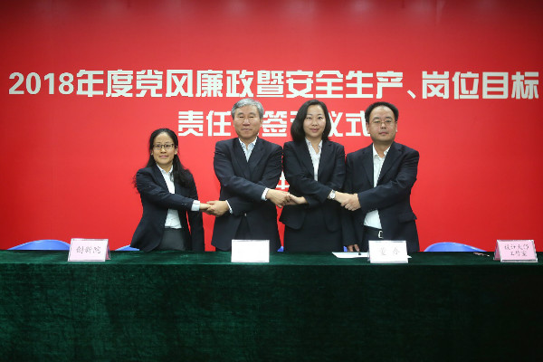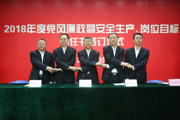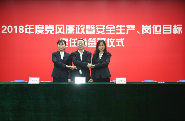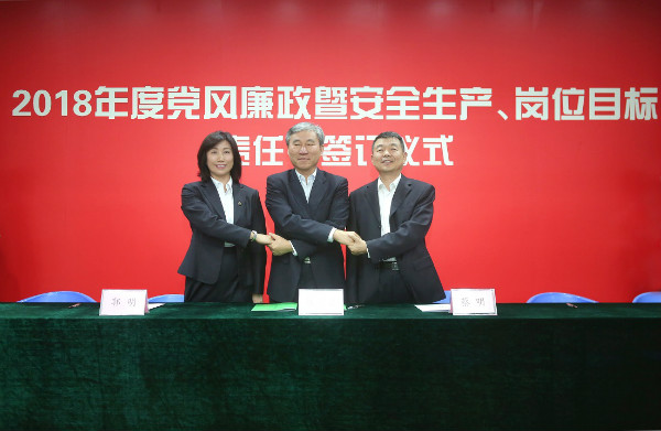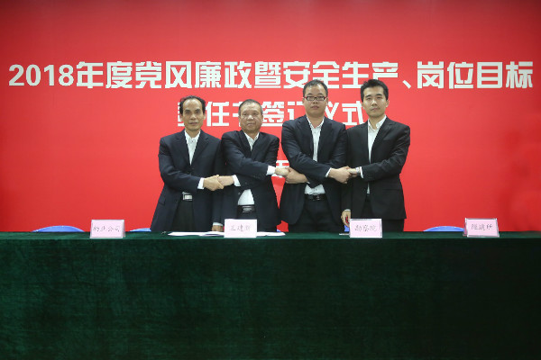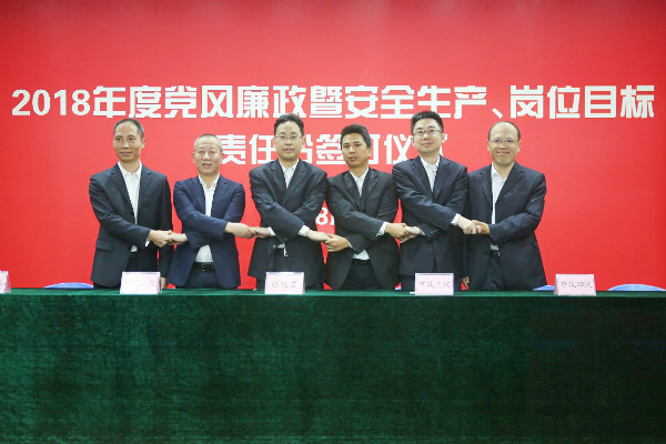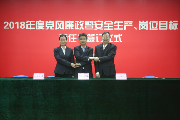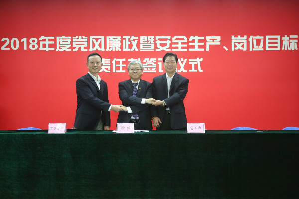 儀式開始,黨委書記、董事長陳宜言與黨委副書記、總經(jīng)理蔡明和黨委副書記、紀委書記、工會主席郭明簽署了《2018年度崗位目標責任書》、《2018年度黨風廉政責任書》及《2018年度安全生產(chǎn)責任書》。黨委副書記、總經(jīng)理蔡明與副總經(jīng)理歐陽宇峰、副總經(jīng)理王建新、副總經(jīng)理張健君、副總經(jīng)理許華林、總工程師徐波簽署責任書。緊接著,各分管領導與分管部門負責人簽署責任書。
