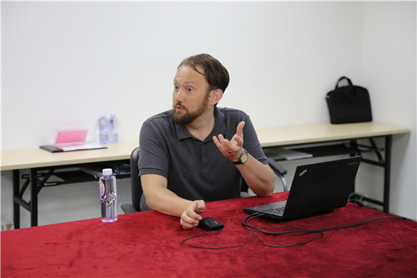 Stuart Buckenham一行在郭明的帶領下先后參觀了公司主樓大堂的“壯闊歲月 再尋初心”主題展、主樓六樓建筑規(guī)劃設計院,隨后前往主樓七樓學術活動室進行座談交流。